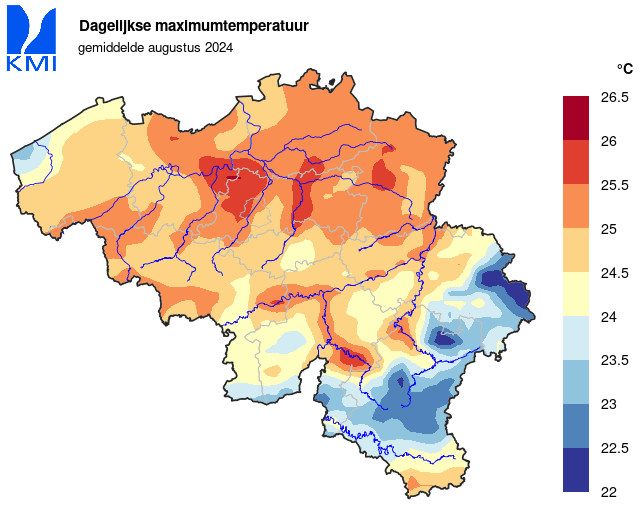 | Gemiddelde maximumtemperatuur | °C | 24.5 | 23 | 26.8 | 2022 | 20.1 | 2014 | |