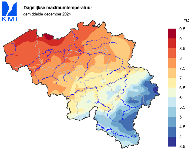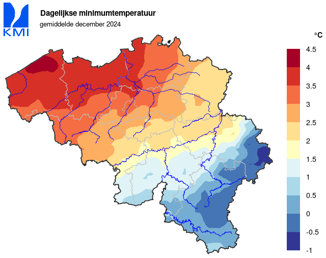 De laagste temperatuur van -7,9°C werd op de 1ste in Neidingen (Sankt Vith) geregistreerd.