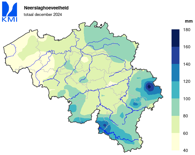 In de rest van ons land viel de grootste neerslaghoeveelheid op de 19de. In Mont-Rigi (Weismes) werd er die dag een hoeveelheid van 44,4 mm gemeten.