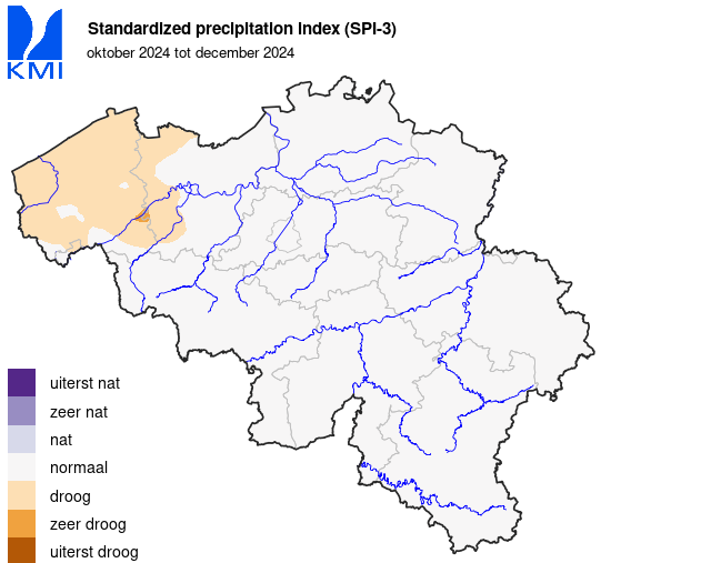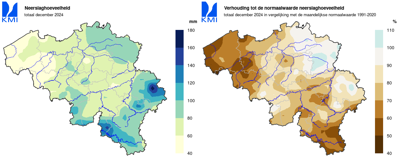 De maandelijkse regionale neerslaghoeveelheden in ons land lagen overal onder de normalen. Ze varieerden van ongeveer 55% van de normale aan de kust en in Belgisch Lotharingen tot ongeveer 95% van de normale in de Kempen.