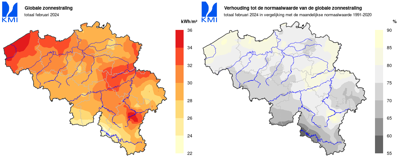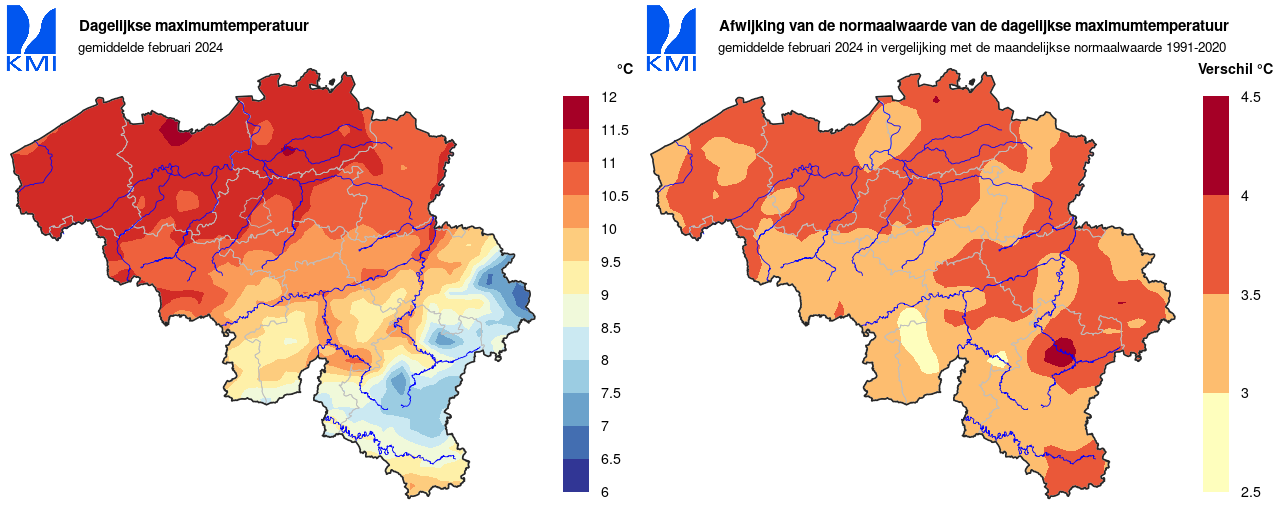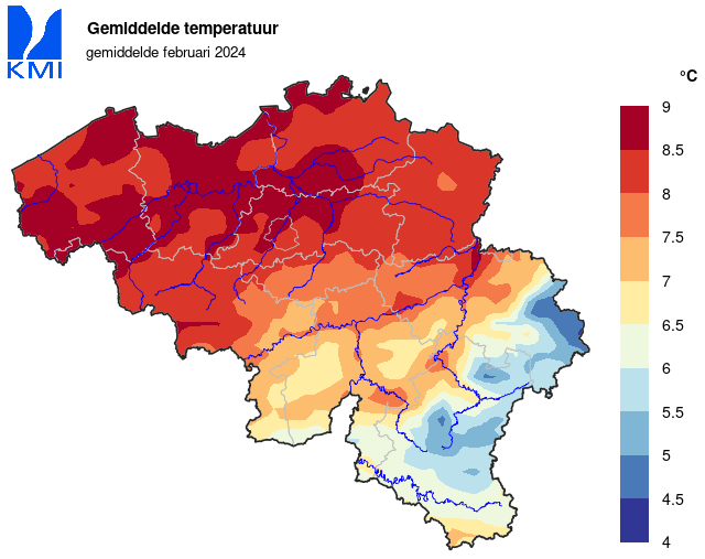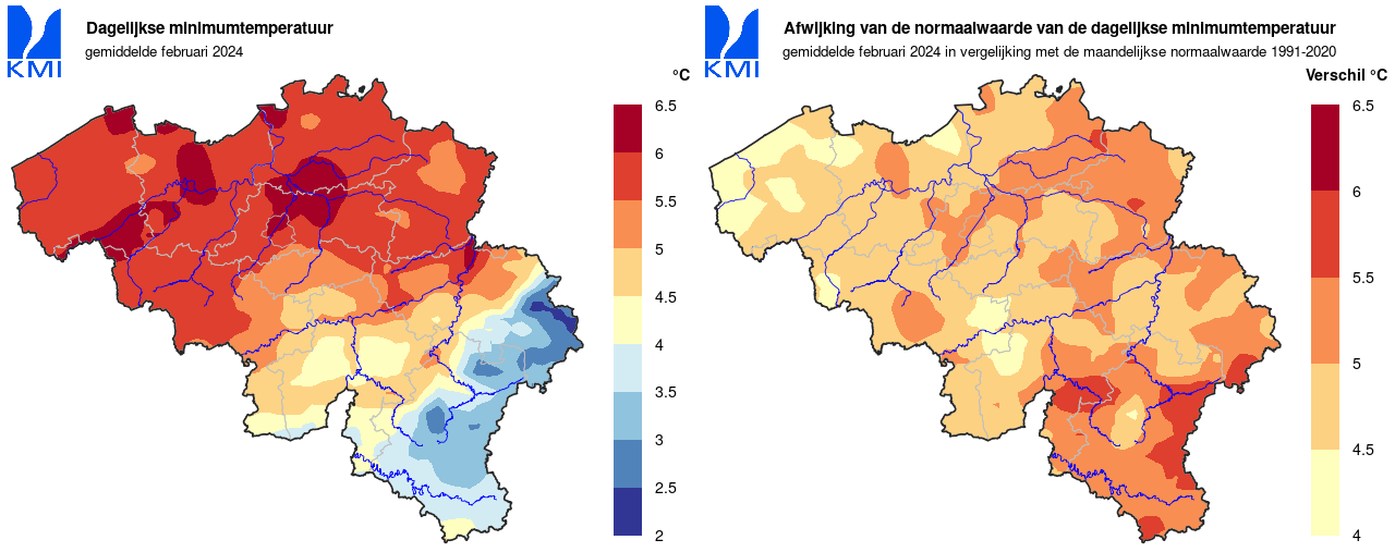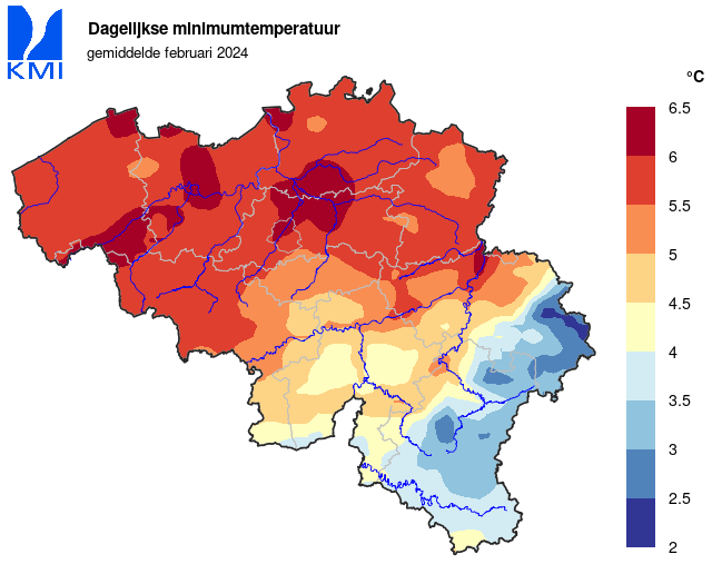 In ons land werd de laagste minimumtemperatuur op 28 februari in Elsenborn (Bütgenbach) gemeten met -5,1°C. Sinds de start van ons landelijke netwerk in 1954 was dit nog maar de zesde februarimaand dat deze waarde boven -6°C lag.