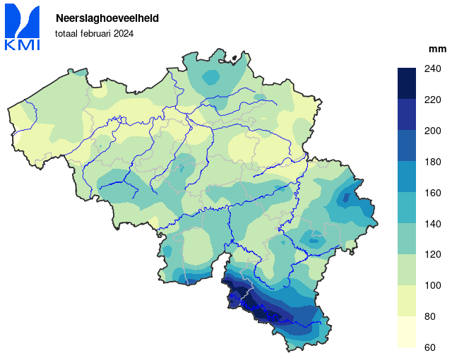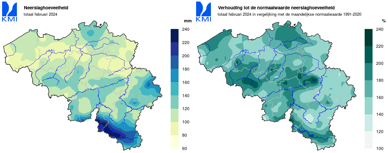 In ons land lagen de maandelijkse neerslagtotalen overal boven de normalen. De minste neerslag viel in de streek van Gileppe en Warche (ongeveer 145% van de normale hoeveelheid) terwijl de meeste neerslag in het Doornikse is gevallen (ongeveer 185% van de normale hoeveelheid).