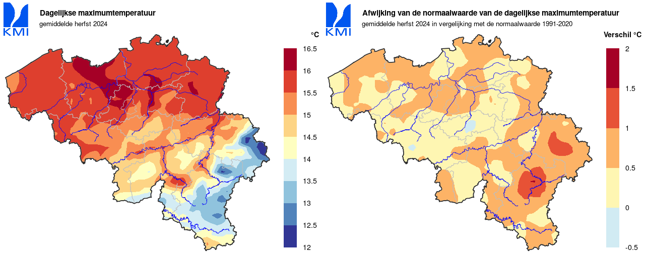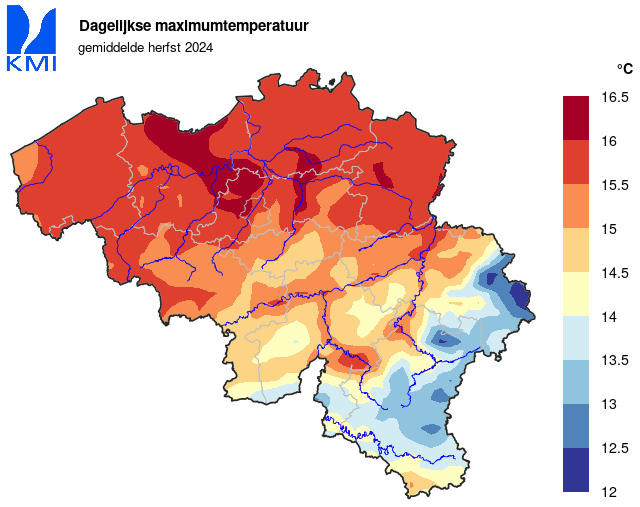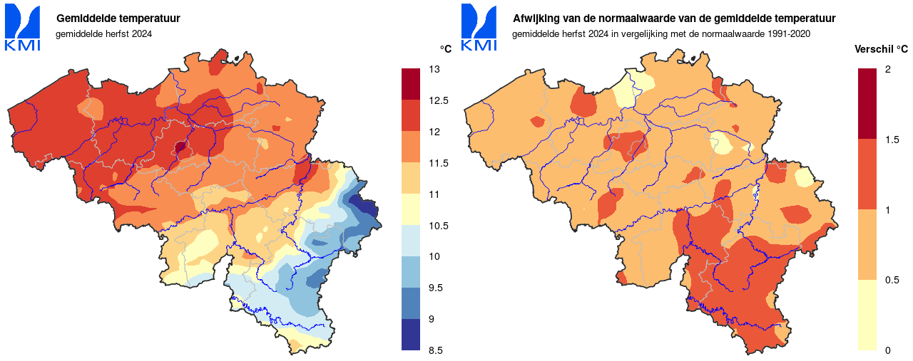 De herfst van 2024 was een beetje warmer dan normaal met een gemiddelde temperatuur van 11,8°C (normaal: 11,2°C). Ook de gemiddelde maximum- en minimumtemperaturen lagen met hun waarden van respectievelijk 15,2°C en 8,8°C boven de normale waarden (resp. 14,8°C en 8°C).