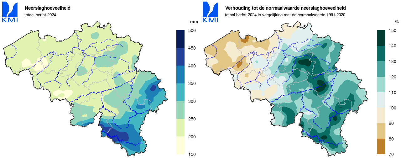 - Deze herfst is reeds het zevende seizoen op een rij met meer neerslag dan gemiddeld. Het is nog maar de tweede keer sinds het begin van de waarnemingen in 1833 dat we een reeks van minstens zeven opeenvolgende te natte seizoenen meemaken. Tussen de lente van 1924 en de winter van 1926 was er sprake van 8 opeenvolgende seizoenen met meer neerslag dan gemiddeld.
