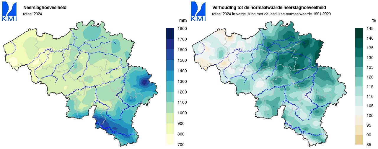 Opvallend: dit record gaat niet gepaard met een record in het aantal neerslagdagen. Integendeel, met 209 dagen eindigt 2024 ver van het absolute record van 1974 (266 dagen, metingen vanaf 1833). Het totaal van dit jaar ligt bovendien vrij dicht bij de normale waarde (189,8 dagen).