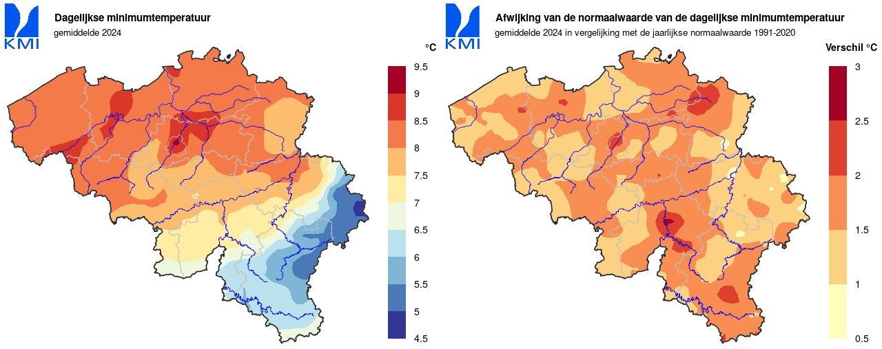 Enkel in januari en juni lag de gemiddelde minimumtemperatuur onder zijn normale waarde. In februari bereikten we een nieuw absoluut record (metingen vanaf 1892).