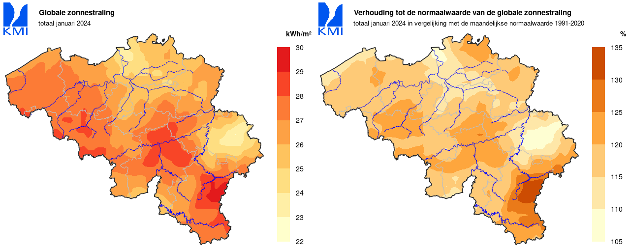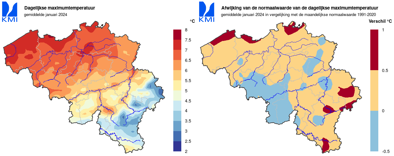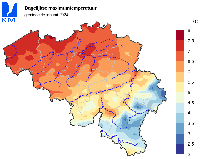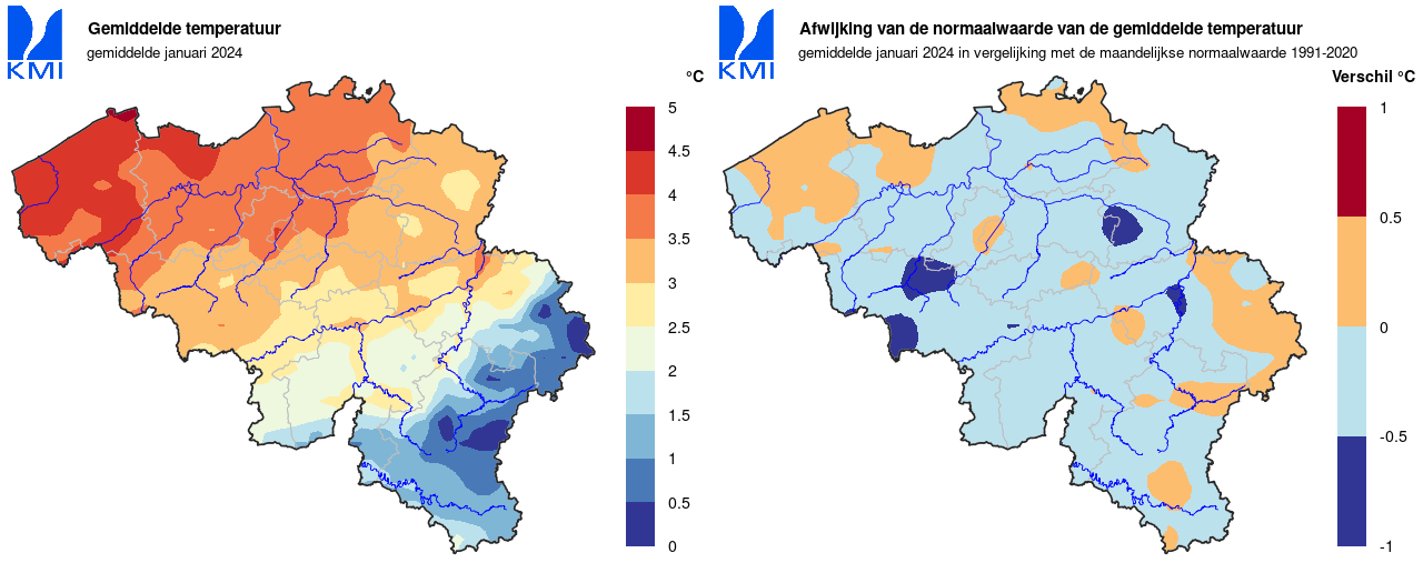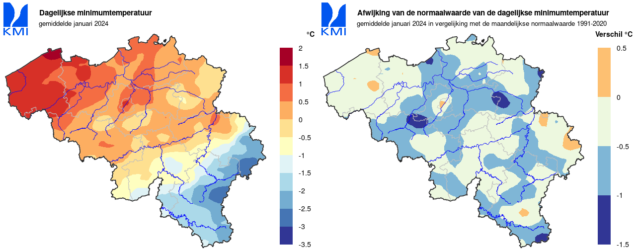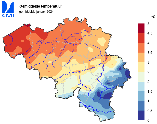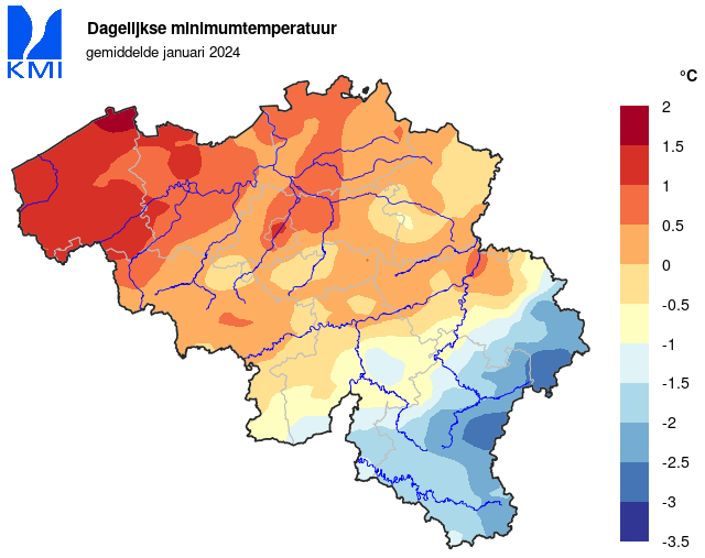In ons land werd de laagste minimumtemperatuur op 21 januari in Elsenborn (Bütgenbach) gemeten met -15,5°C. De hoogste temperatuur werd op de 28ste in Gemmenich (Plombières) geregistreerd met 16,1°C.