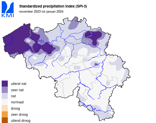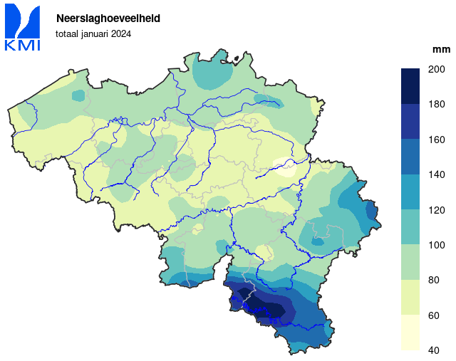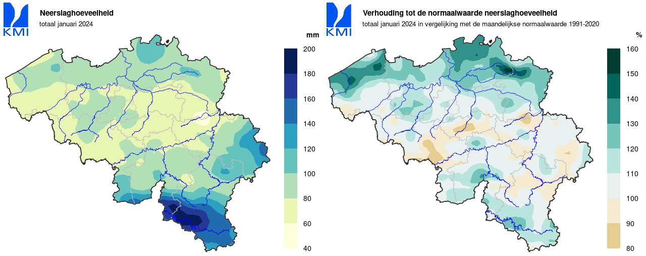 In het klimatologisch meetnet van het KMI werd het grootste dagtotaal op 2 januari in Witry (Léglise) gemeten (61,6 mm).