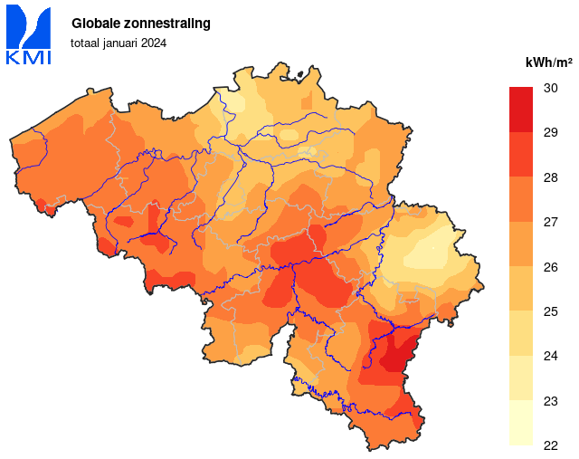 | Globale zonnestraling | kWh/m² | 24.4 | 21.9 | 28.7 | 2006 | 16.8 | 2023 | |