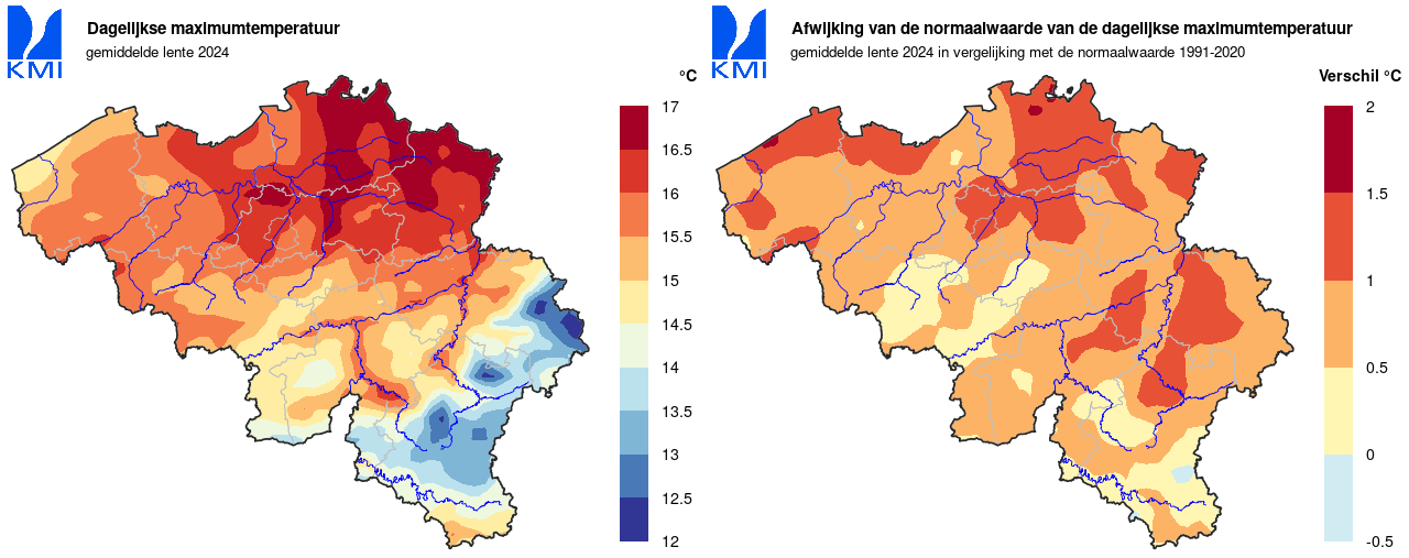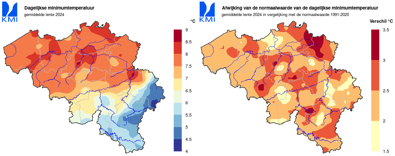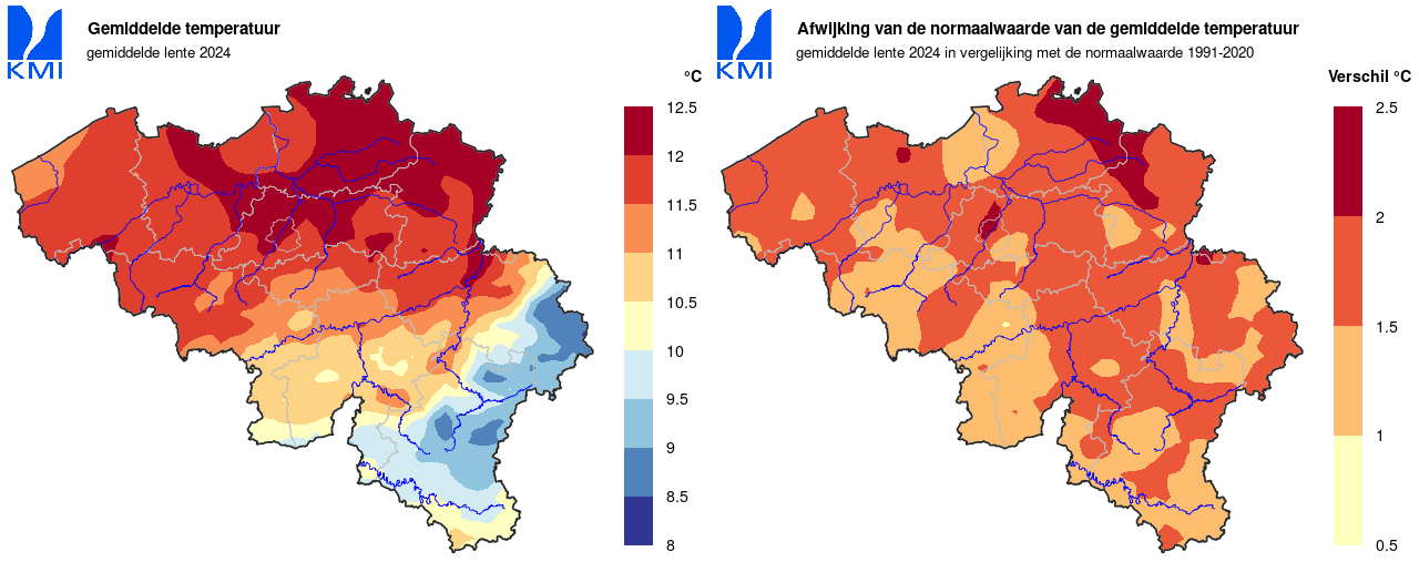 - Maart 2024: een gemiddelde waarde van 5,7°C (normaal: 3,5°C), de tweede hoogste voor de huidige referentieperiode en de vierde hoogste voor de volledige periode (vanaf 1892).