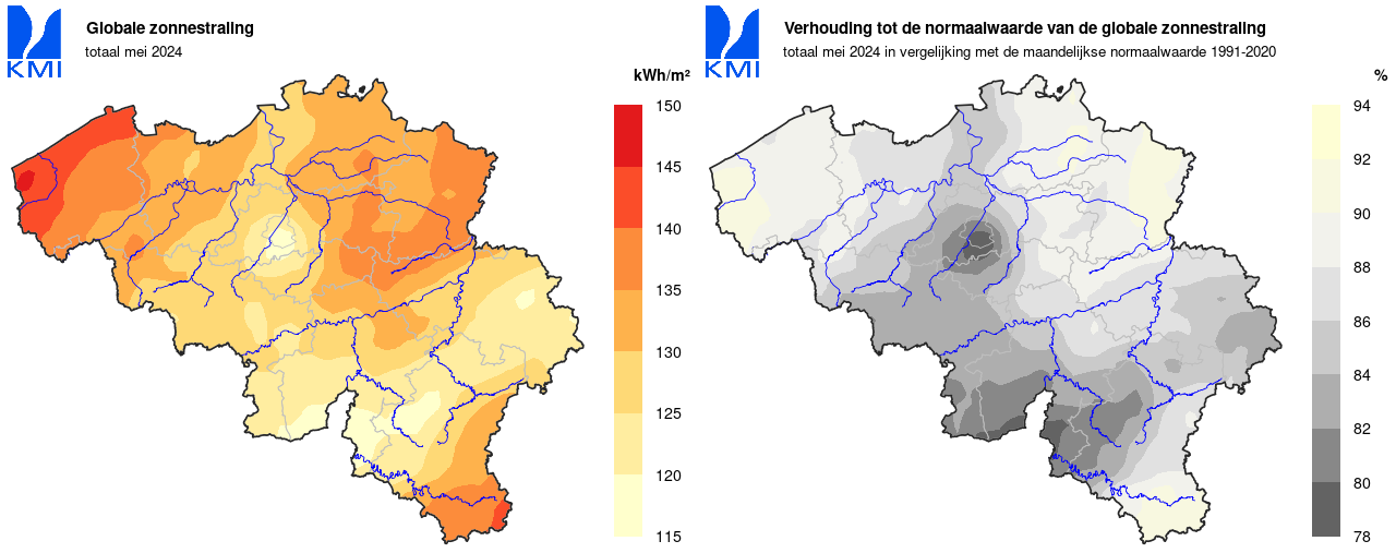 De zonneschijnduur bedroeg de afgelopen maand slechts 140u 02min in Ukkel (normaal: 198u 17min). Dit is nauwelijks meer dan tijdens de eveneens sombere maand april 2024 (132u 50min, normaal 171u 16min). Uiteindelijk eindigde mei 2024 op de vierde plaats van sombere meimaanden (huidige referentieperiode), nog ruim achter het record van 1996 (97u 11min).
