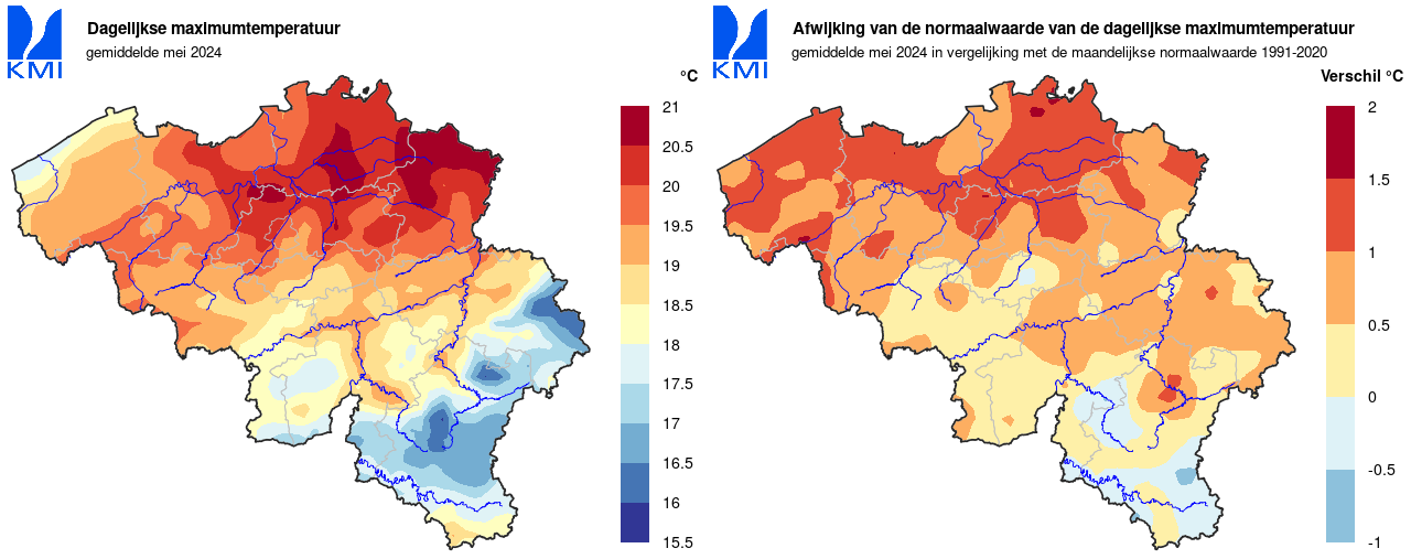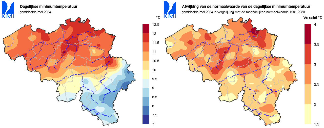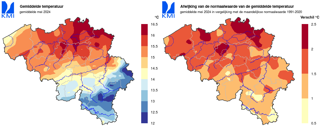 In ons land werd de laagste minimumtemperatuur op 4 mei in Elsenborn (Bütgenbach) gemeten met 0,6°C. De hoogste temperatuur werd op 14 mei in Meeuwen (Oudsbergen) geregistreerd met 28,3°C.