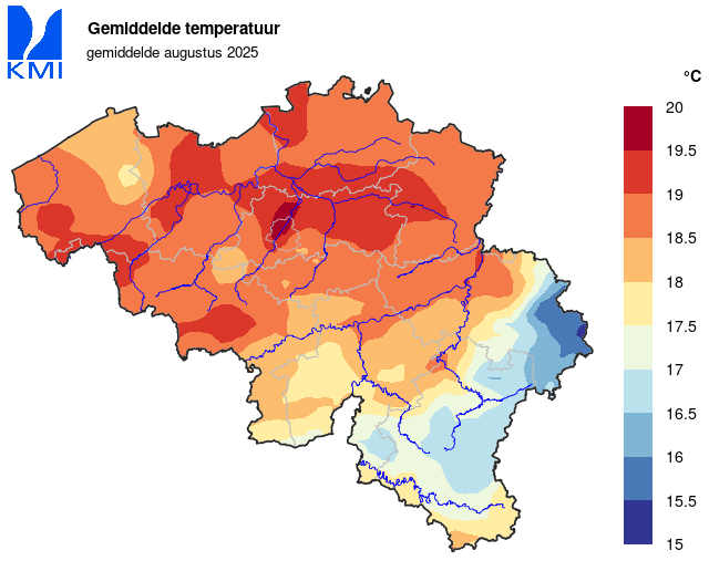 In Ukkel bedroeg de gemiddelde temperatuur van de maand augustus 19,3°C (normaal: 18,4°C). De gemiddelde temperaturen bleven er vooral tijdens de tweede decade en aan het einde van de derde decade boven hun respectievelijke normalen.