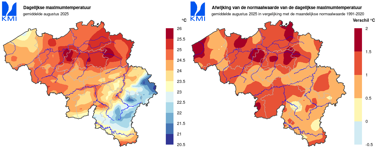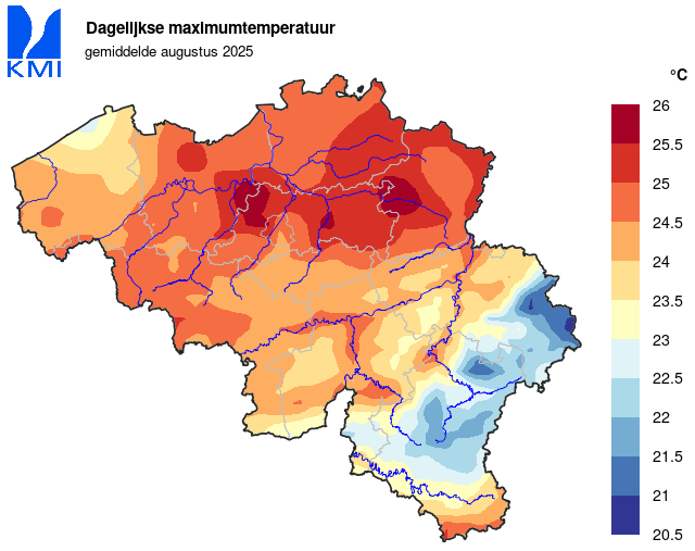 Ook de gemiddelde maximumtemperatuur lag met 24,3°C boven de normale waarde (23°C) terwijl de gemiddelde minimumtemperatuur (14,1°C) slechts lichtjes afwijkt van de normale waarde (13,9°C).