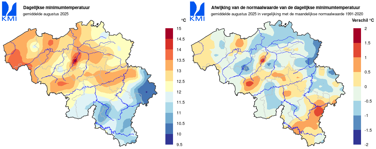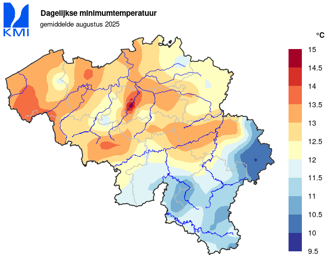 In de rest van ons land werd de laagste minimumtemperatuur op 25 augustus in Elsenborn (Bütgenbach) gemeten met 0,0°C. De hoogste maximumtemperatuur werd op de 12de in Dilbeek geregistreerd met 35,0°C.