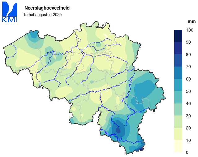 In het klimatologisch meetnet van het KMI werd het grootste dagtotaal op 29 augustus in De Haan gemeten (45,4 mm).