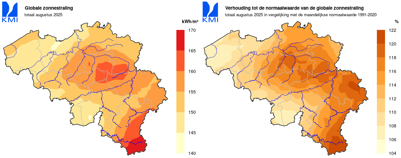 De maand augustus was zonniger dan gemiddeld: 233u 32min (normaal: 192u 26min). Vooral de tweede decade viel op: met een zonneschijnduur van 98u 03min was dit de derde zonnigste tweede augustusdecade van de huidige referentieperiode. Enkel 1997 (met 110u 50min) en 1995 (101u 20min) waren nog zonniger.