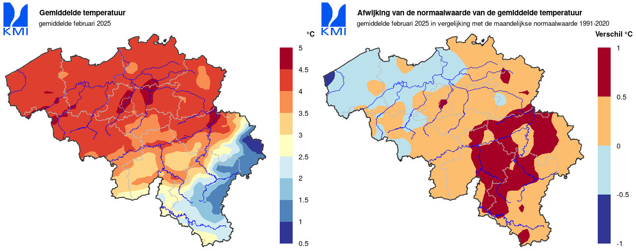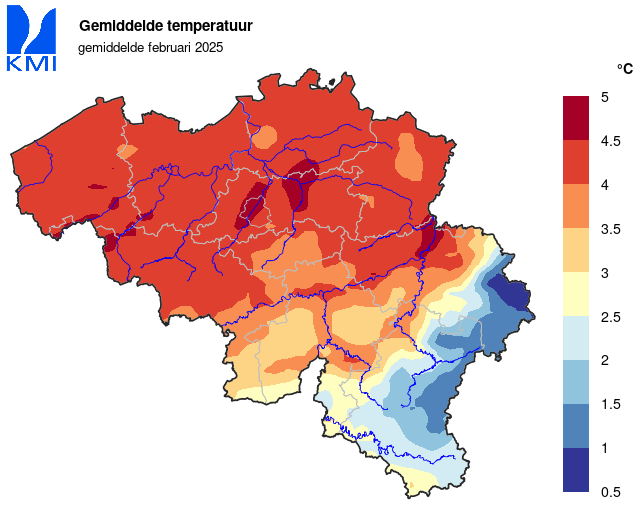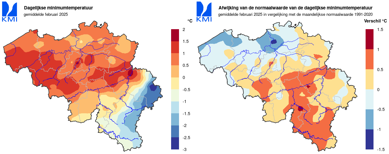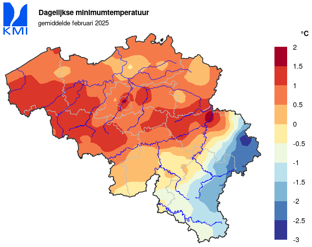 In ons land werd de laagste minimumtemperatuur op 18 februari in Elsenborn (Bütgenbach) gemeten met -11,7°C. De hoogste temperatuur werd op de 21ste in Kapelle-op-den-Bos geregistreerd met 19,8°C.
