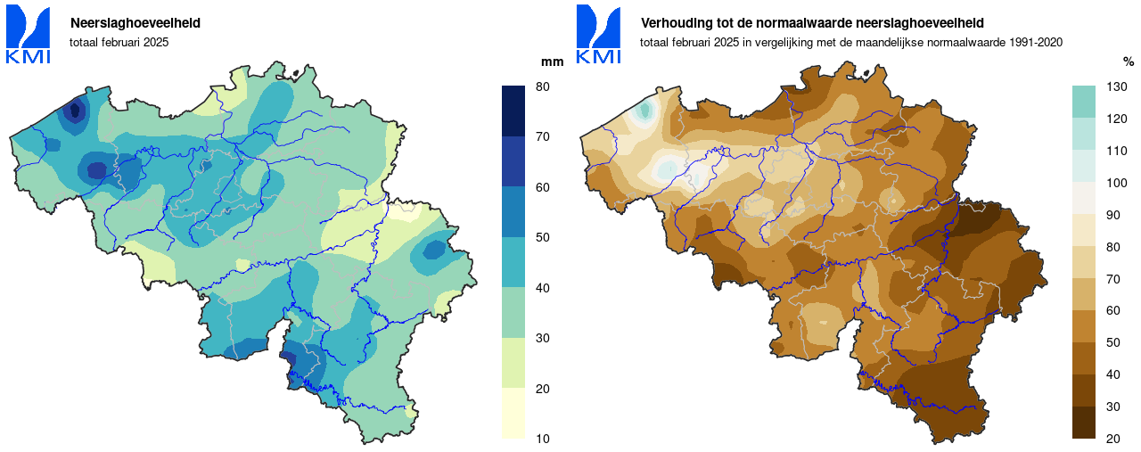 In ons land lagen de maandelijkse neerslagtotalen overal ruim onder de normalen. De minste neerslag viel in het Land van Herve (ongeveer 30% van de normale hoeveelheid) terwijl de meeste neerslag in Vlaanderen is gevallen (ongeveer 70% van de normale hoeveelheid).