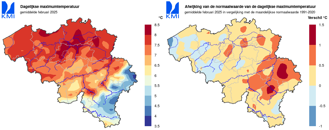De temperaturen varieerden in Ukkel tussen -4,0°C (18 februari) en 18,2°C (21 februari). Deze laatste waarde is de derde hoogste van de huidige referentieperiode. Enkel in 2019 (20,2°C) en 2021 (18,7°C) registreerden we hier nog hogere maxima in februari.
