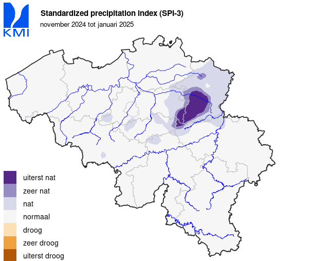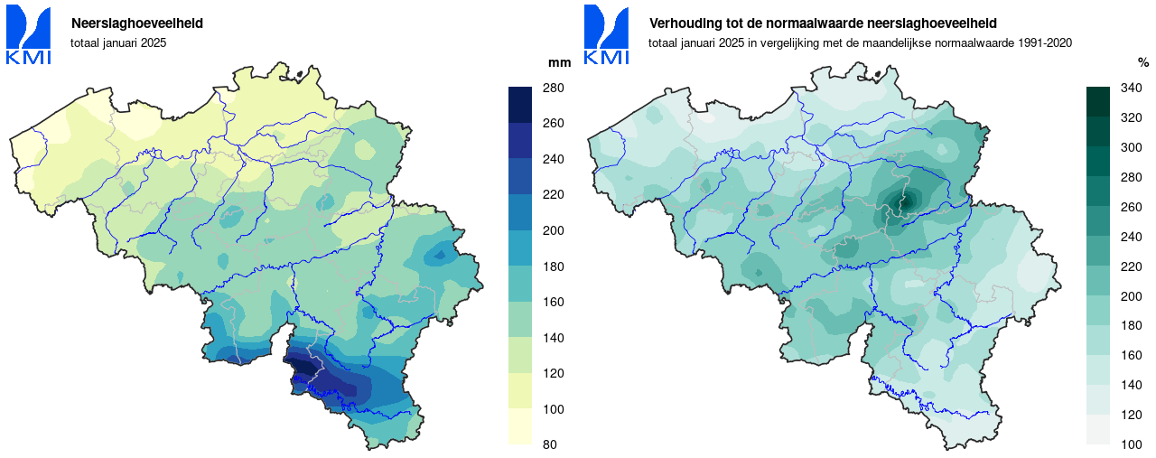 In het klimatologisch meetnet van het KMI werd het grootste dagtotaal op 8 januari in Witry (Léglise) gemeten (35,0 mm).