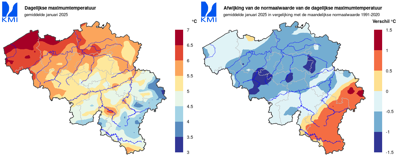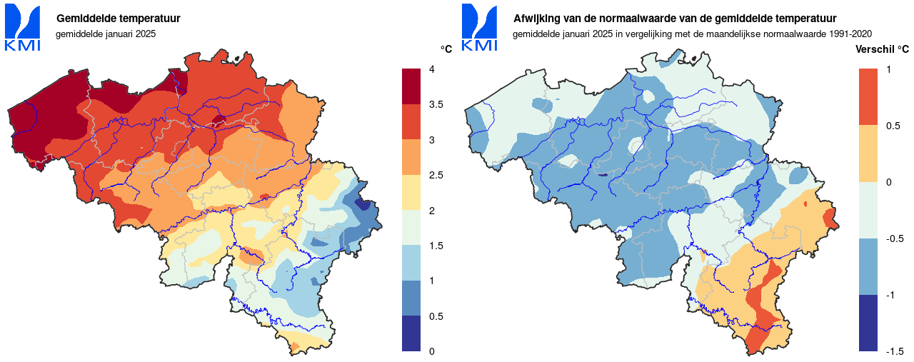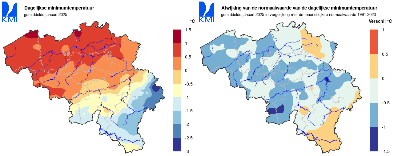 In ons land werd de laagste minimumtemperatuur op 14 januari in Elsenborn (Bütgenbach) gemeten met -15,3°C. De hoogste temperatuur werd op de 27ste in Blauberg (Herselt) geregistreerd met 13,4°C.