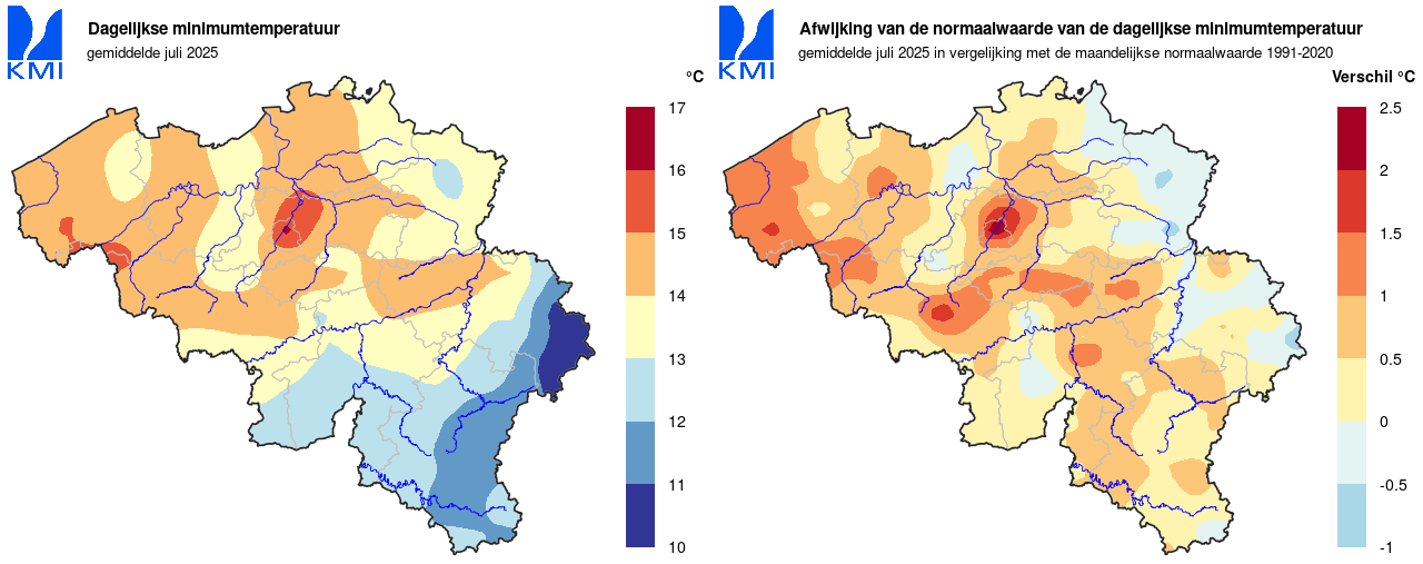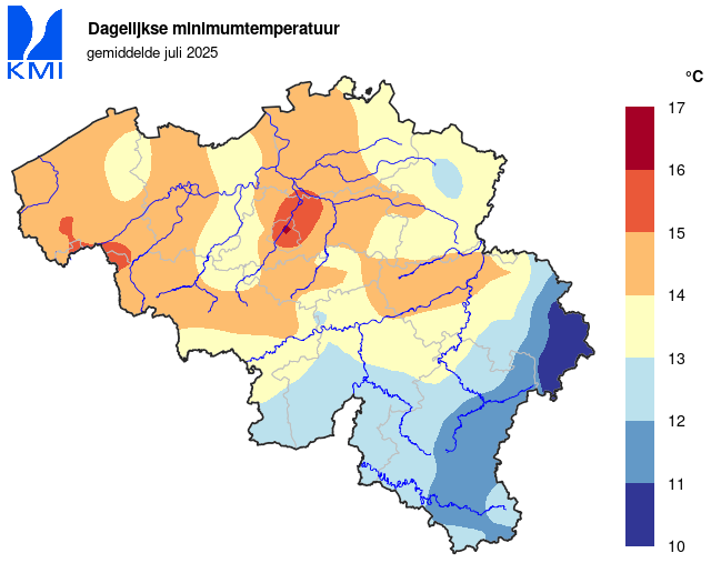 In de rest van ons land werd de laagste minimumtemperatuur op 10 juli in Elsenborn (Bütgenbach) gemeten met 4,3°C. De hoogste maximumtemperatuur werd op de 2de in Diepenbeek geregistreerd met 38,3°C.