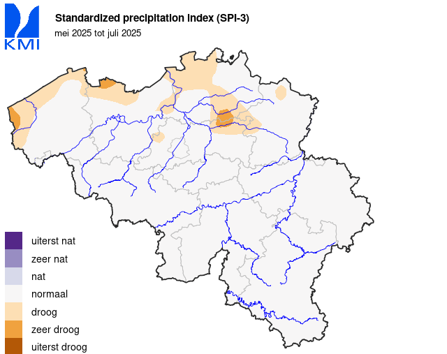 In ons land schommelden de maandelijkse neerslagtotalen rond de normalen. De minste neerslag viel aan de kust (ongeveer 70% van de normale hoeveelheid) terwijl de meeste neerslag in de Condroz is gevallen (ongeveer 150% van de normale hoeveelheid).