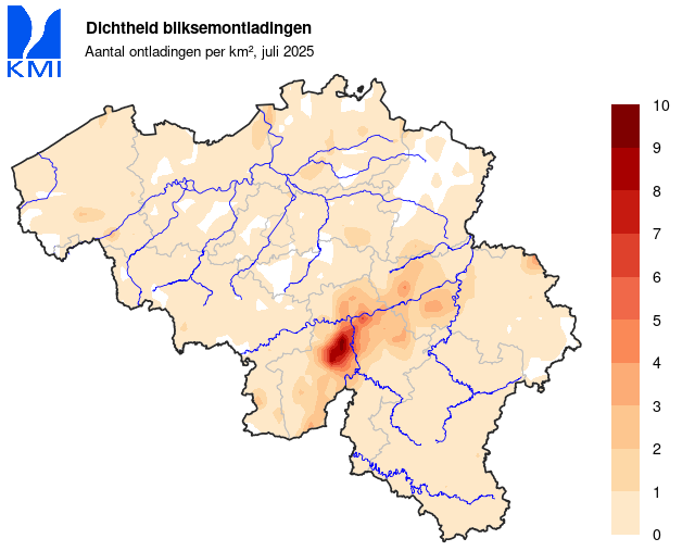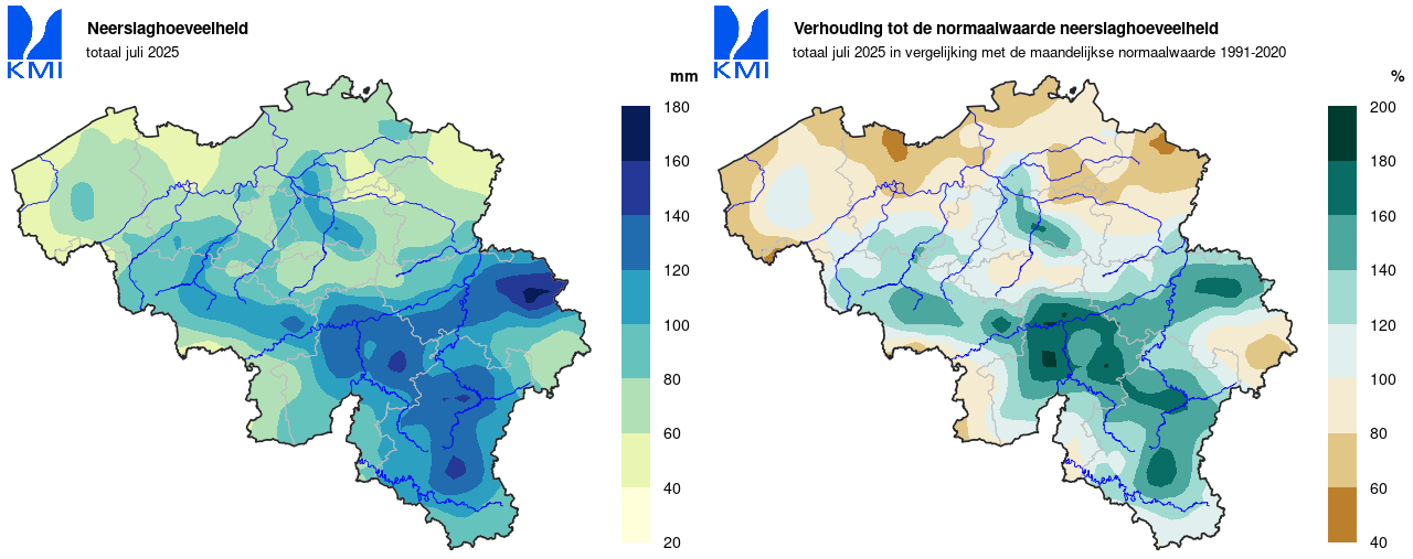 In het klimatologisch meetnet van het KMI werd het grootste dagtotaal op 6 juli in Herne (Pajottegem) gemeten (58,9 mm).