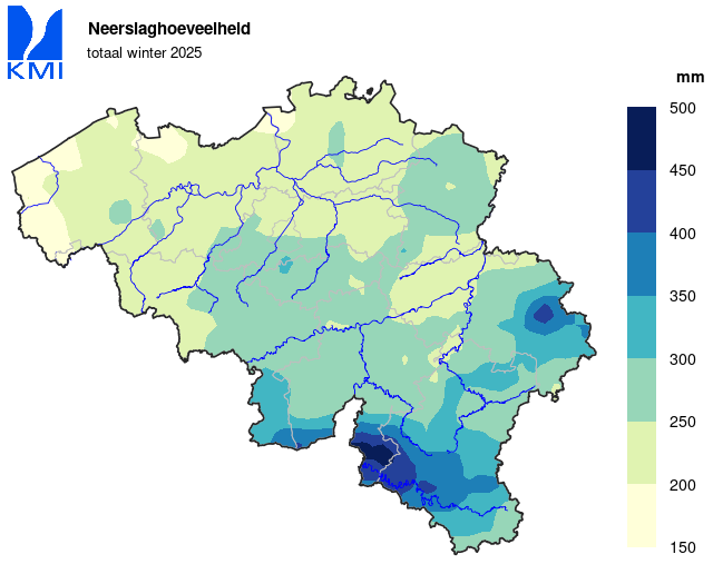 In totaal viel er de afgelopen winter 278,3 mm neerslag in Ukkel (normaal: 228,6 mm).