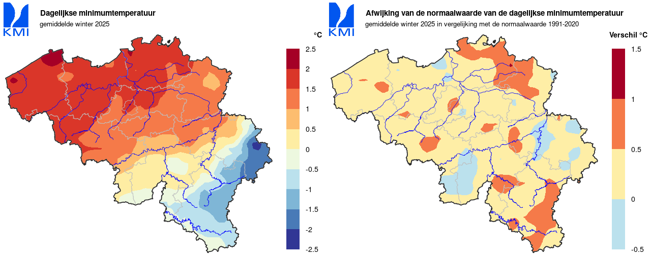 - De absolute minimumtemperatuur van -4,0°C is de derde hoogste waarde voor de huidige referentieperiode achter 2014 (-0,5°C) en 2020 (-2,5°C).