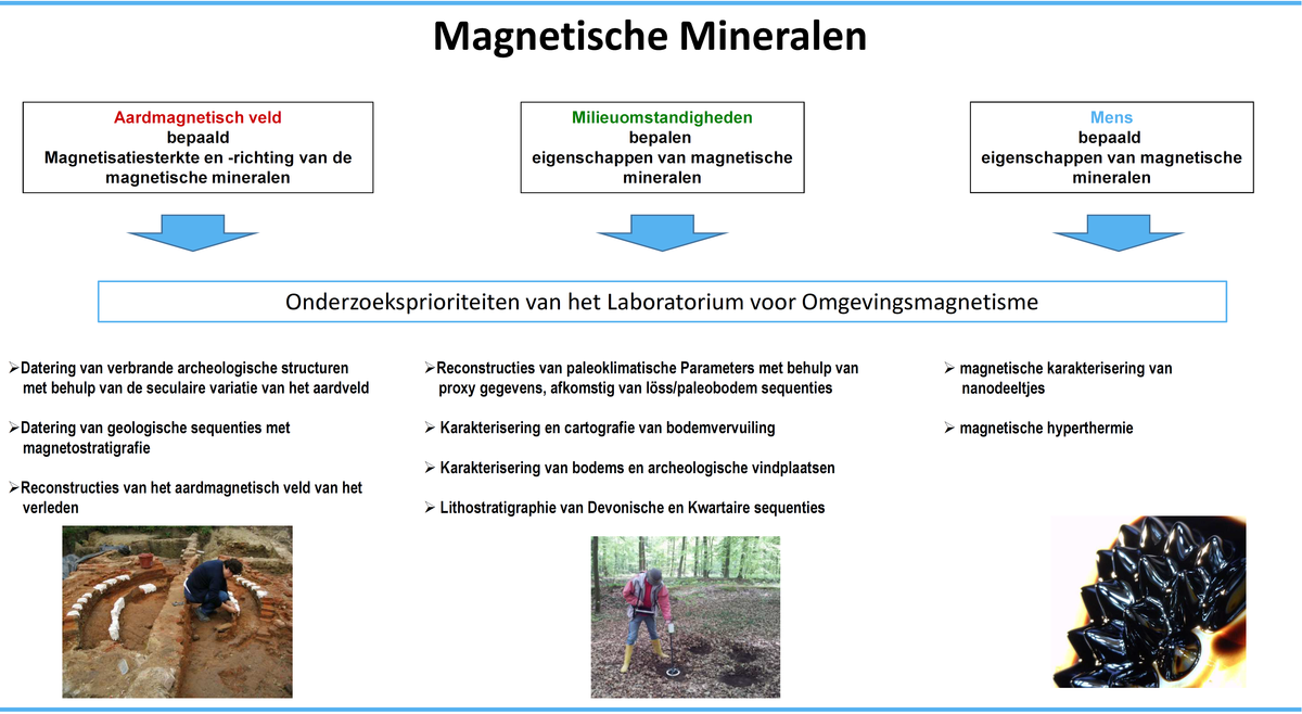 Omgevingsmagnetisme maakt gebruik van het feit dat ijzer een van de meest voorkomende chemische elementen in de aardkorst is. In combinatie met zuurstof en zwavel vormt het magnetische mineralen die bijna overal in ons milieu aanwezig zijn. Het Laboratorium voor Omgevingsmagnetisme streeft de volgende drie onderzoeksgebieden na: