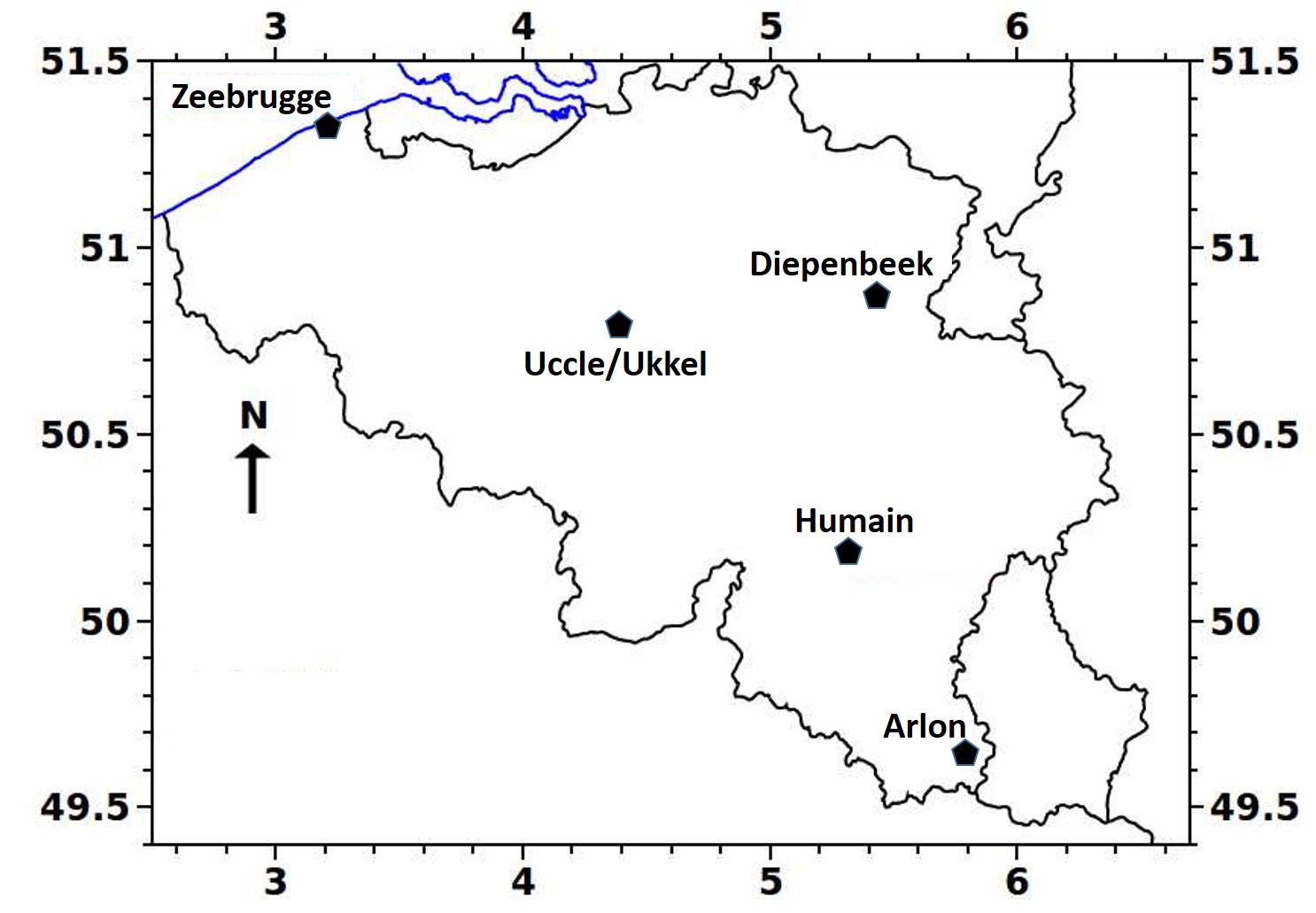 Sinds 2014 beschikt het KMI over een netwerk van LIDAR-ceilometers, waarmee we de wolkenbasis en verticale profielen van atmosferische aerosolen kunnen meten. Onderstaande figuur toont een kaart van dit netwerk, dat geïnstalleerd werd om België zo goed mogelijk te bedekken. Sinds 2011 gebeuren metingen met de LIDAR-ceilometer in Ukkel en in 2021 werd het netwerk uitgebreid met een LIDAR-ceilometer in Aarlen.