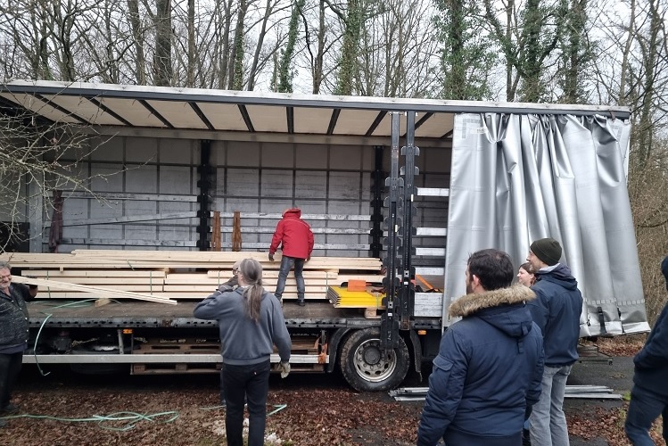 2. Levering van bouwmaterialen: balken voor het houten geraamte.