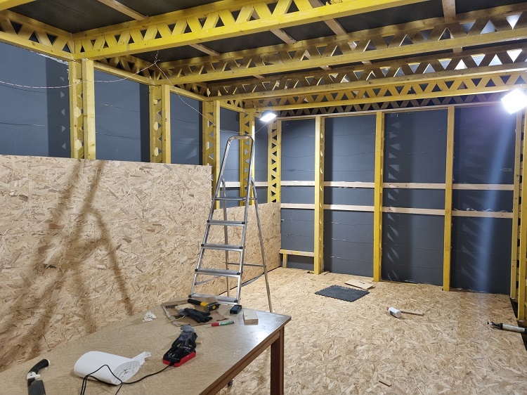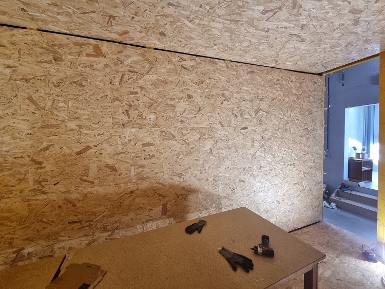 25. Montage van de definitieve binnenwanden van OSB-panelen.