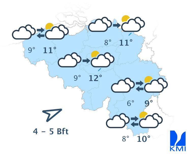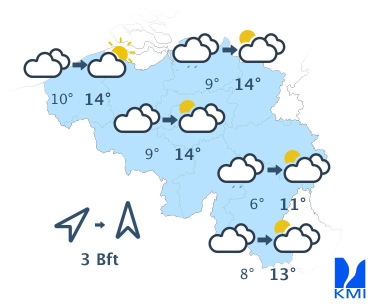 Donderdag is het vaak bewolkt maar overwegend droog. We verwachten soms ook enkele opklaringen. Op het einde van de dag wordt het zwaarbewolkt en neemt de kans op lichte regen toe. Het wordt geleidelijk zachter met tegen de avond temperaturen tussen 3 à 5 graden in de Ardennen, rond 6 graden in het centrum en tot 9 graden in het uiterste westen. De wind ruimt naar het zuidwesten en wordt in het binnenland matig en aan zee vrij krachtig.