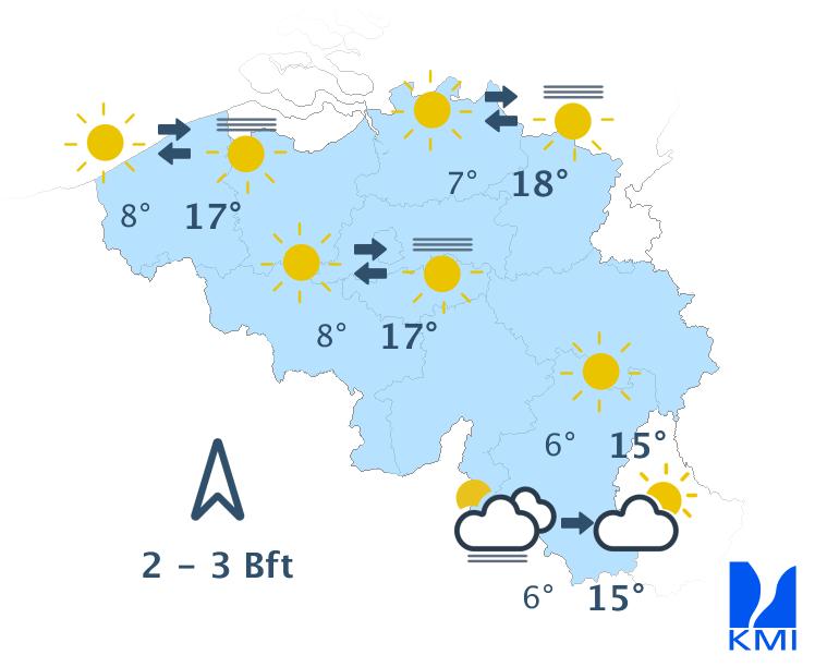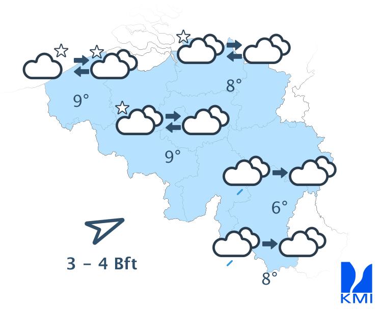 Vannacht neemt de bewolking verder toe met meer lage en middelhoge wolken vanaf het zuidwesten. Op het reliëf kunnen de lage wolken het zicht lokaal belemmeren. Het blijft droog bij vriestemperaturen. Er kunnen hierdoor rijmplekken gevormd worden. De minima liggen tussen 0 of -1 graad aan zee en -9 graden in sommige Ardense valleien bij een zwakke tot matige zuidenwind.