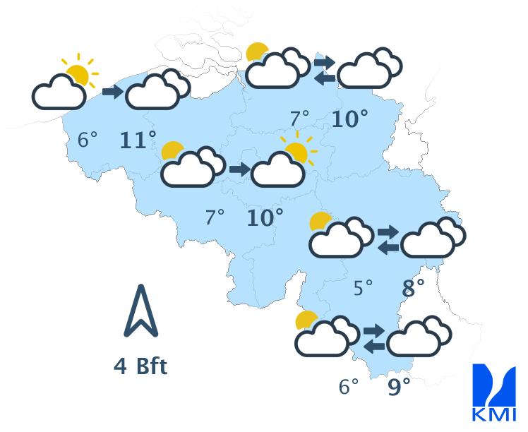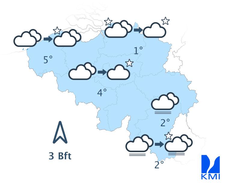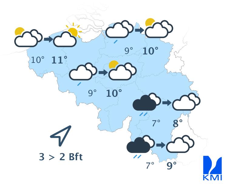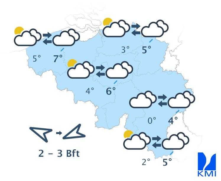 Vandaag begint grijs met hier en daar nevel of mist en kans op wat motregen. In de loop van de dag verdwijnt de mist en blijft het in de meeste streken zwaarbewolkt. In de Ardennen kunnen er in de namiddag opklaringen gevormd worden, die zich nadien uitbreiden naar het noordoosten van het land. De maxima schommelen tussen 5 en 9 graden bij een zwakke tot overwegend matige wind uit zuidelijke richtingen.
