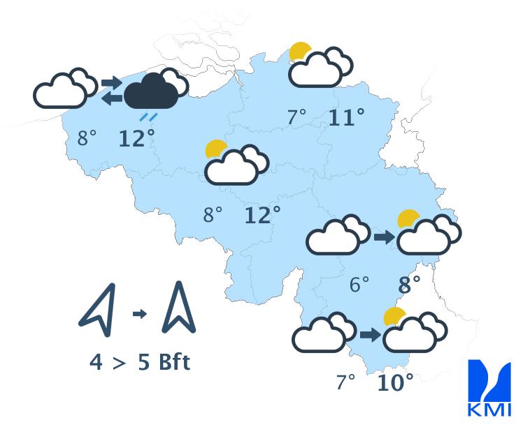 Zaterdag zijn er veel wolkenvelden en blijft het op een lokaal spatje regen na droog. Het wordt enkele graden minder zacht. De maxima schommelen rond 8 of 9 graden in het centrum.
