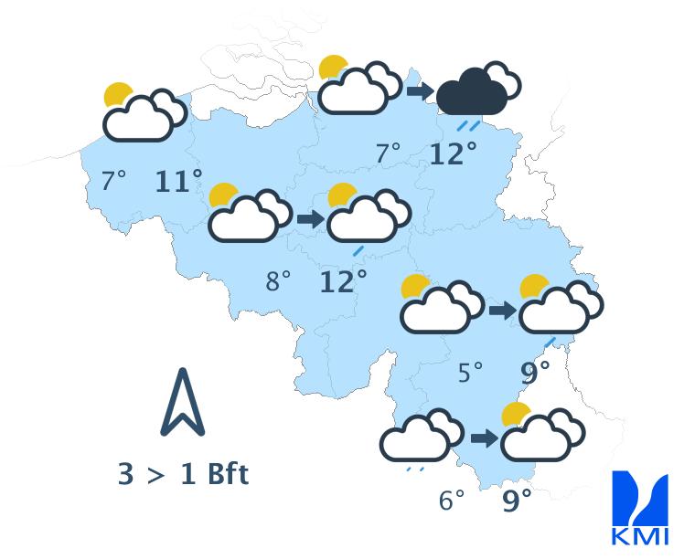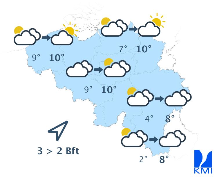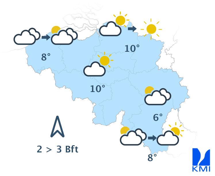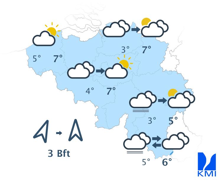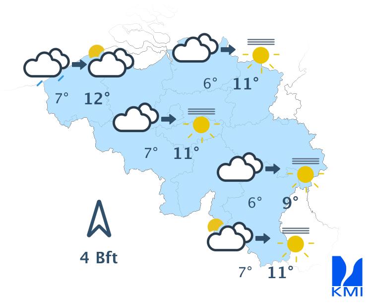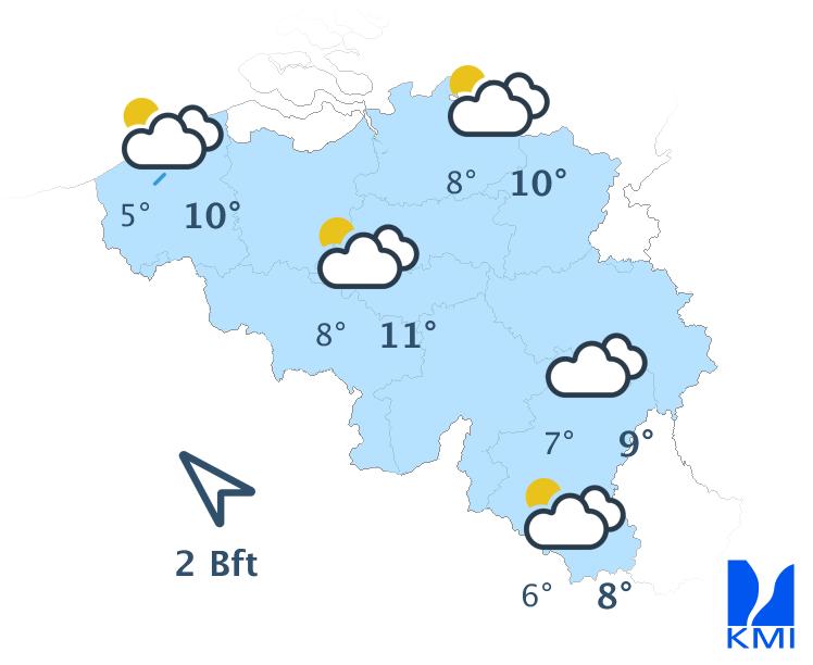 Morgenochtend is het vrij zonnig in een groot deel van het land met echter kans op hardnekkiger ochtendgrijs in het uiterste westen, langs de zuidflank van de Ardennen en in Belgisch Lotharingen. In de namiddag blijft het grotendeels vrij zonnig met hoge en middelhoge wolken vanaf het zuiden. De maxima schommelen tussen 5 of 6 graden in de Hoge Venen en 10 of 11 graden in de Kempen bij een meestal matige wind uit zuid tot zuidzuidoost. Op de hoogten in het oosten is hij soms vrij krachtig met rukwinden rond 50 of 55 km/h.