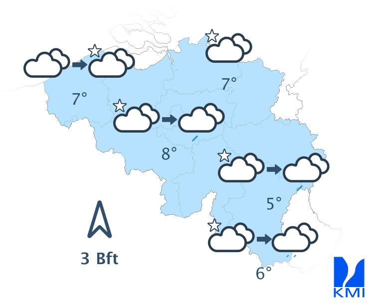 Vannacht start in vele streken nog zwaarbewolkt, maar stilaan verschijnen er brede opklaringen vanaf het noordoosten. In het tweede deel van de nacht breiden ze zich geleidelijk uit naar het centrum van het land. De lage wolken blijven hardnekkig hangen langs de zuidflank van de Ardennen (waar ze het zicht nog vaak beperken) en waarschijnlijk ook in het uiterste westen van het land. De minima liggen tussen 1 of 2 graden in het zuidoosten van het land en in de Kempen en tot 4 of 5 graden in het westen van Vlaanderen. De wind is meestal matig uit het zuiden met rukwinden rond 45 of 50 km/h, vooral aan de kust en op de hoogten in het oosten.