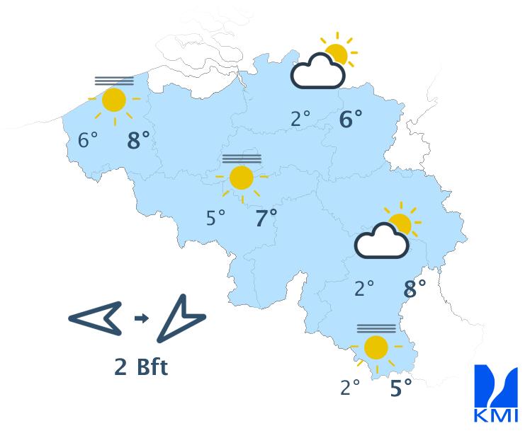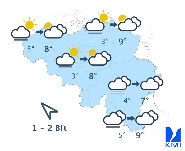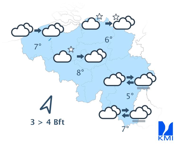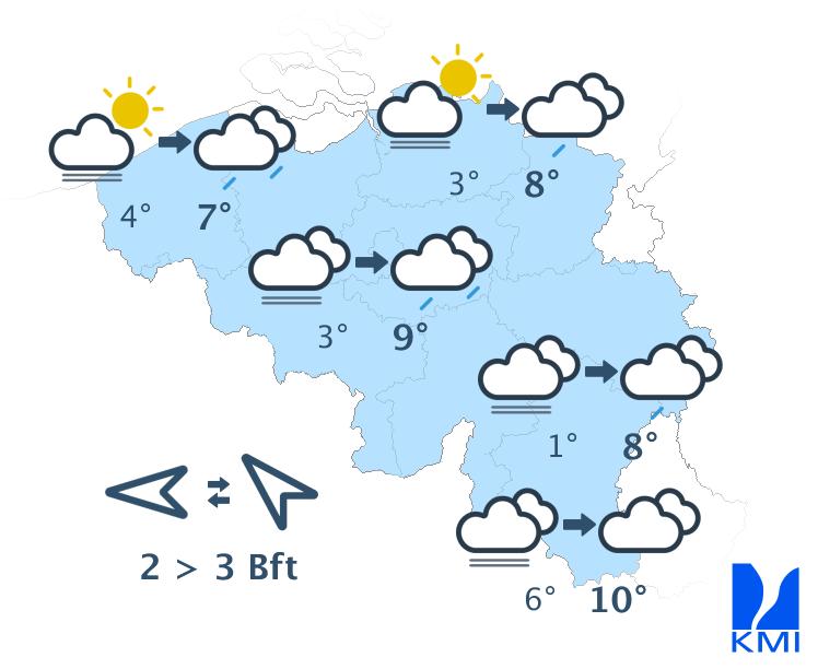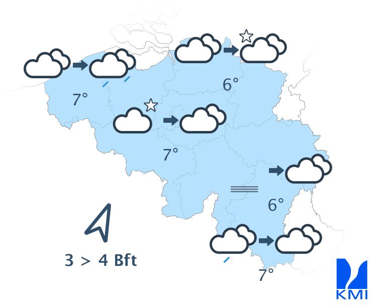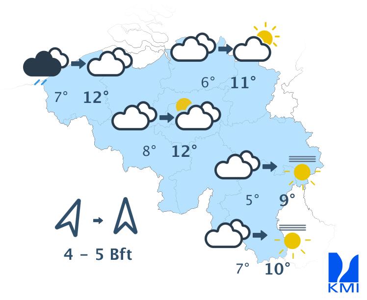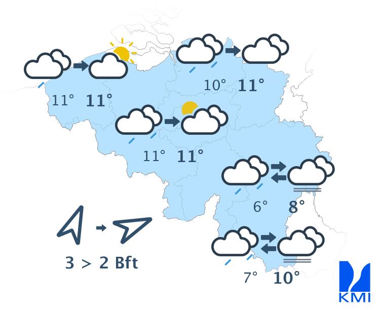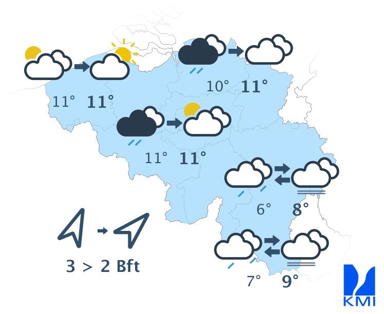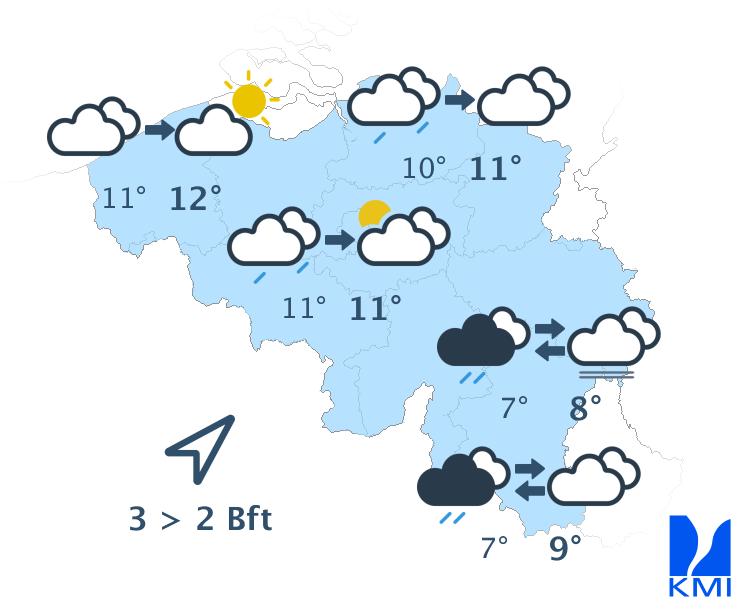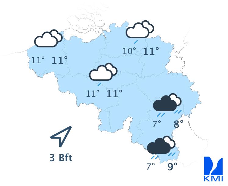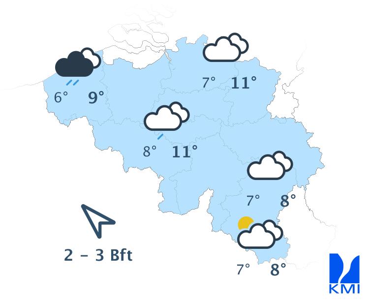 Morgen is het zwaarbewolkt met lichte tot matige regen. In het uiterste westen wordt het snel droog met mooie opklaringen. Rond de middag wordt het ook droog in het centrum, maar in het oosten en zeker in het zuidoosten kan het nog gans de namiddag blijven druppelen. Op het reliëf kunnen de lage wolken het zicht soms beperken. De maxima liggen tussen 8 graden in de Hoge Venen en 11 graden in Laag-België. De wind waait eerst matig uit zuidzuidwest, met vooral op de Ardense hoogten nog kans op rukwinden tot rond 50 km/h. Bij de doortocht van de regenzone ruimt de wind naar zuidwest tot west, waarna de windkracht afneemt naar zwak tot matig.
