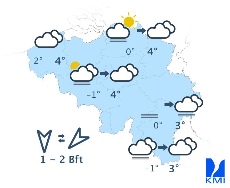 Maandag stroomt koudere lucht over ons land. Het wordt gedeeltelijk bewolkt met enkel middelhoge en hoge wolkenvelden. De maxima liggen tussen 4 en 8 graden. De wind waait zwak tot matig uit noordoost tot oost. 's Nachts kan het licht gaan vriezen.