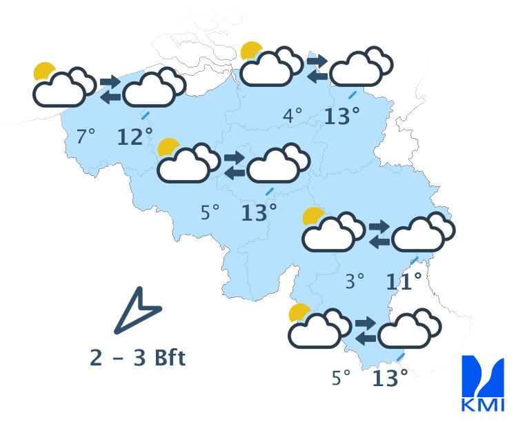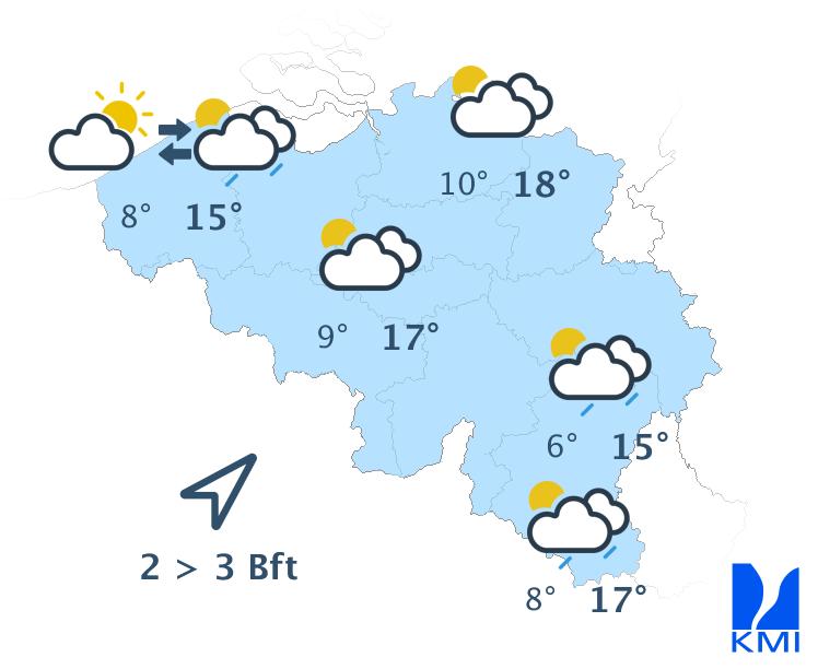 Dinsdagochtend is het grijs en eventueel mistig in het noordwesten van het land. Elders is het zonnig. In de loop van de dag en avond wordt het halfbewolkt met kans op enkele buien, eventueel met een donderslag. Het wordt een paar graden minder zacht met maxima tussen 12 en 16 of lokaal nog 17 graden. De wind blijft zwak waaien uit veranderlijke richtingen.