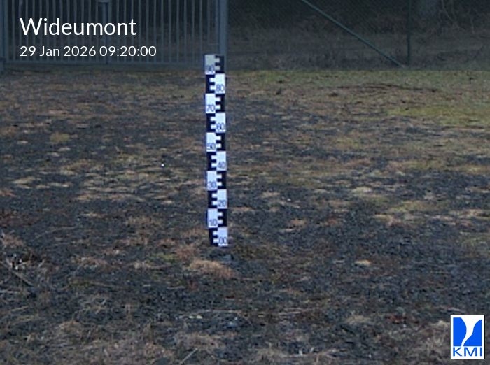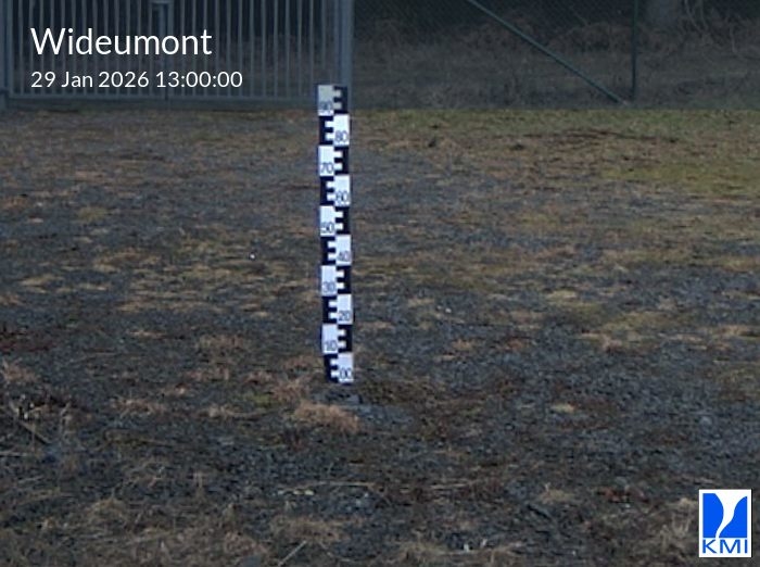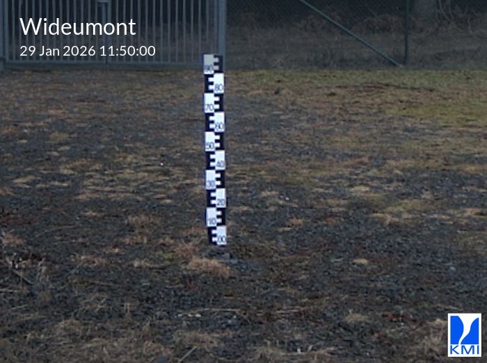 De meetlat op het beeld laat toe om de actuele sneeuwhoogte (in cm) in te schatten.